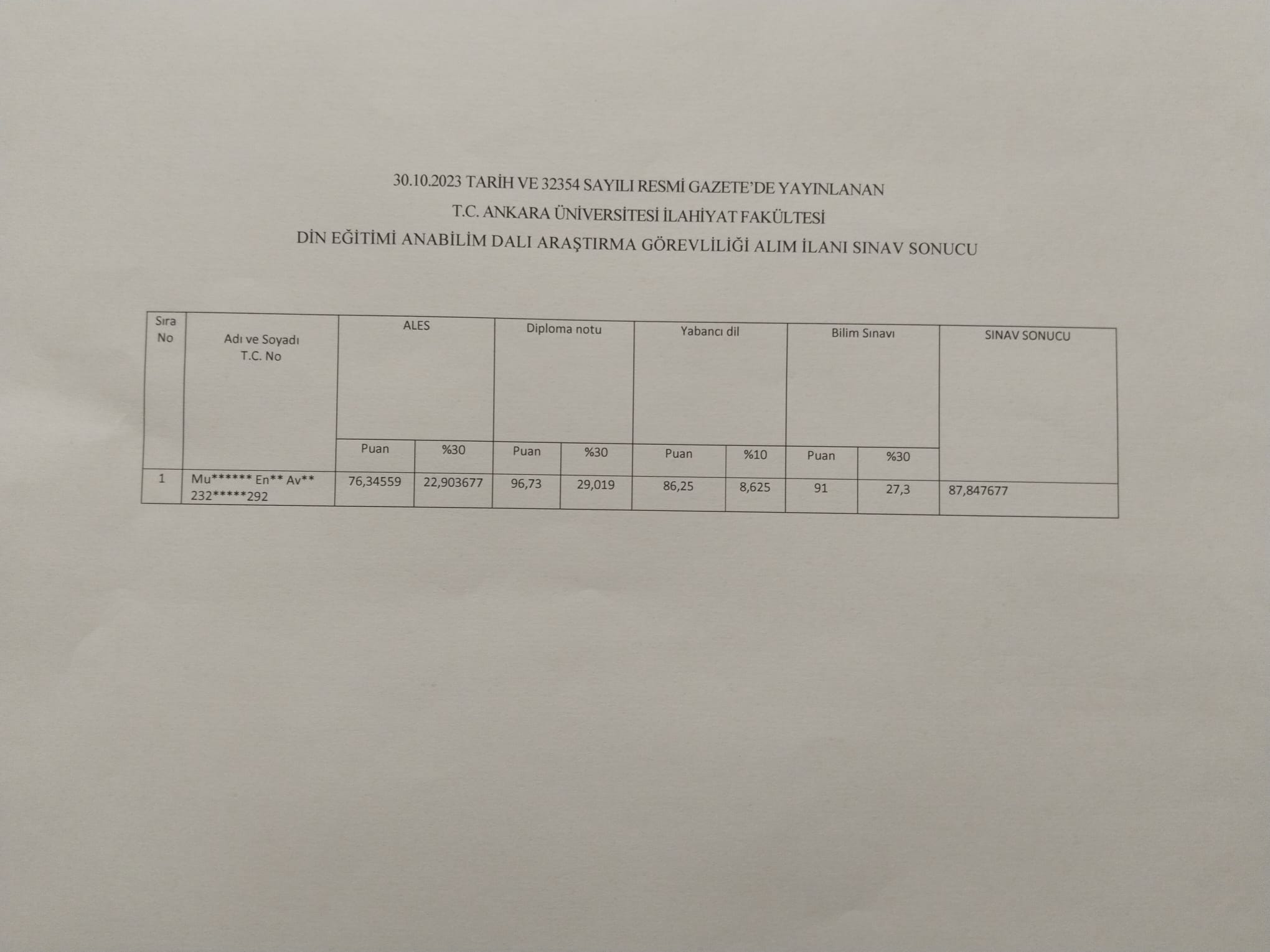 Din Eğitimi Anabilim Dalı Araştırma Görevliliği Alım İlanı Sınav Sonucu